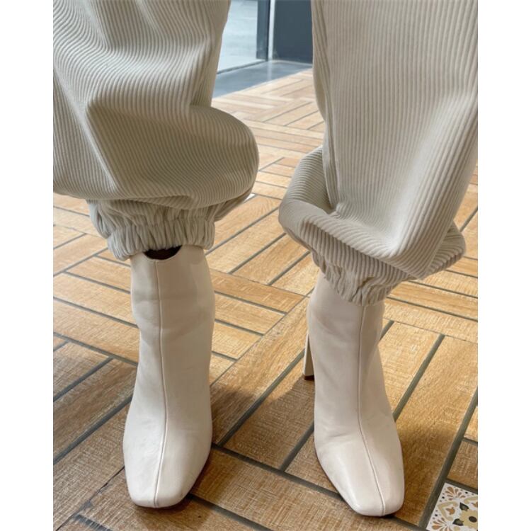 裾の絞りが足元をすっきりと見せ、様々なシューズとの相性も抜群です。