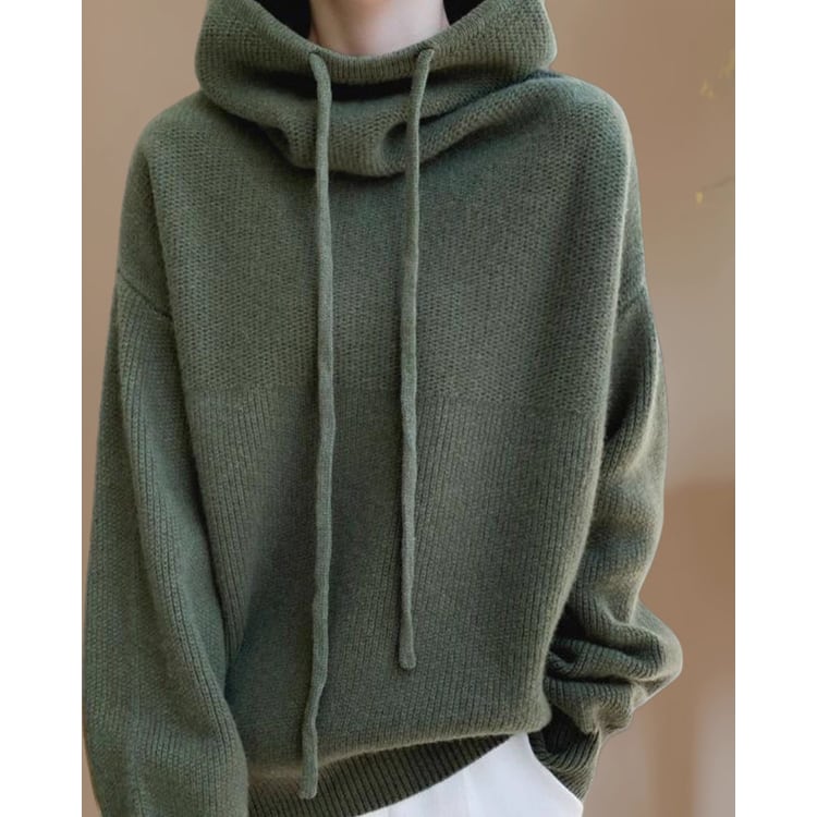 ドローストリングネックが特徴の長袖ニットプルオーバー。