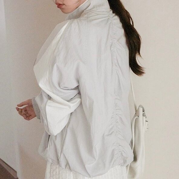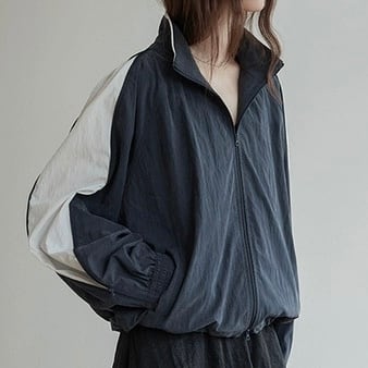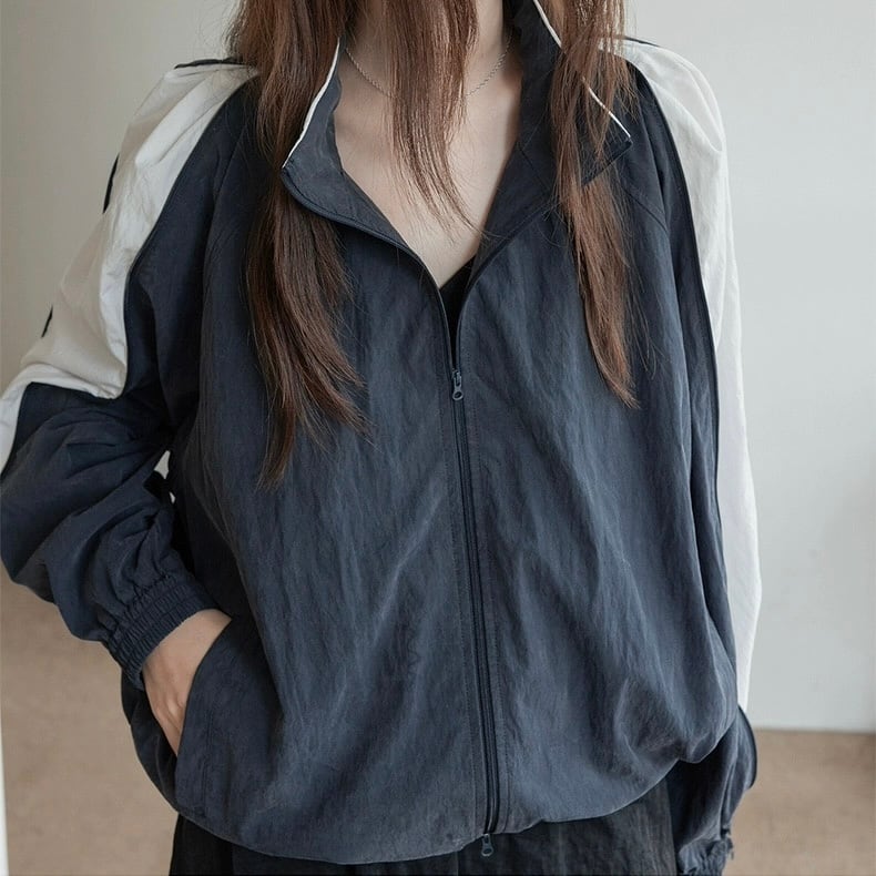 配色の切り替えが目を引く、ショート丈のジップアップジャケットです。