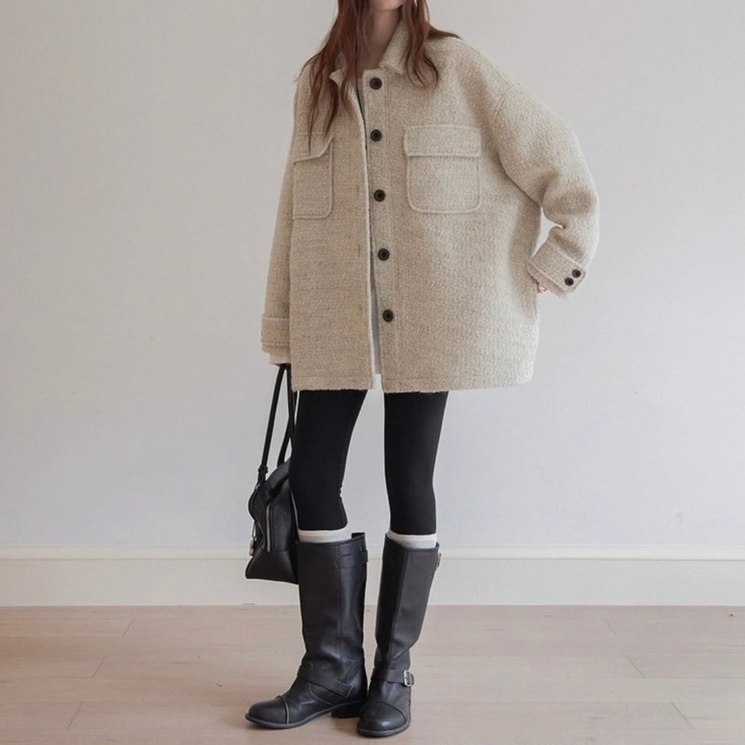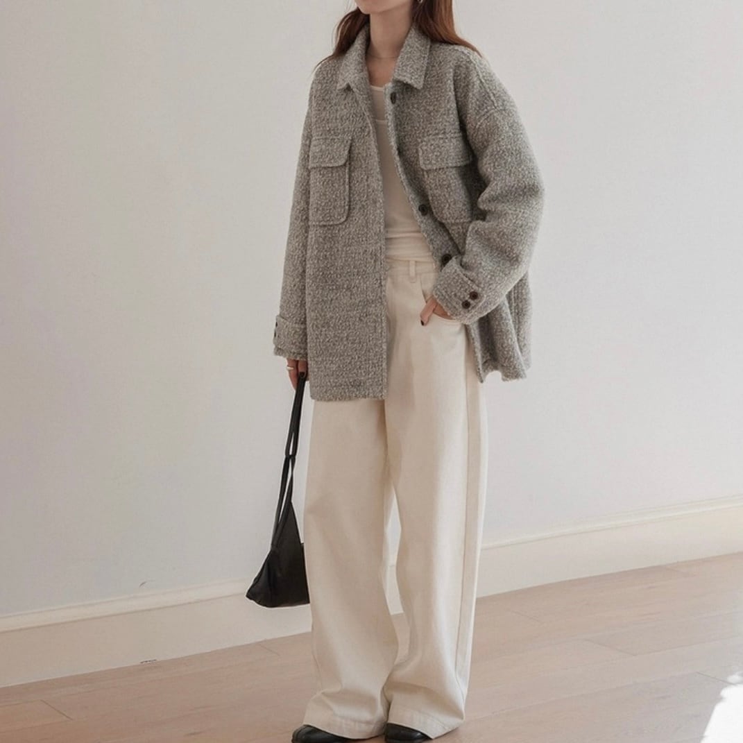 シャツカラーとヒップ丈が特徴のジャケットです。