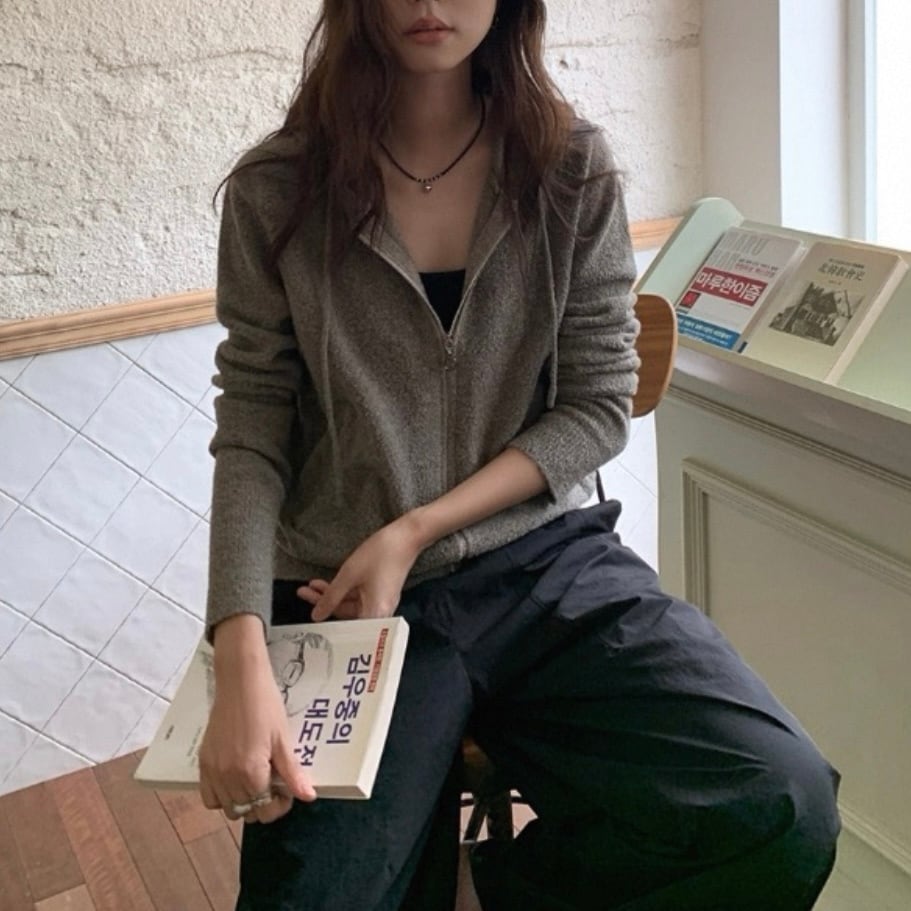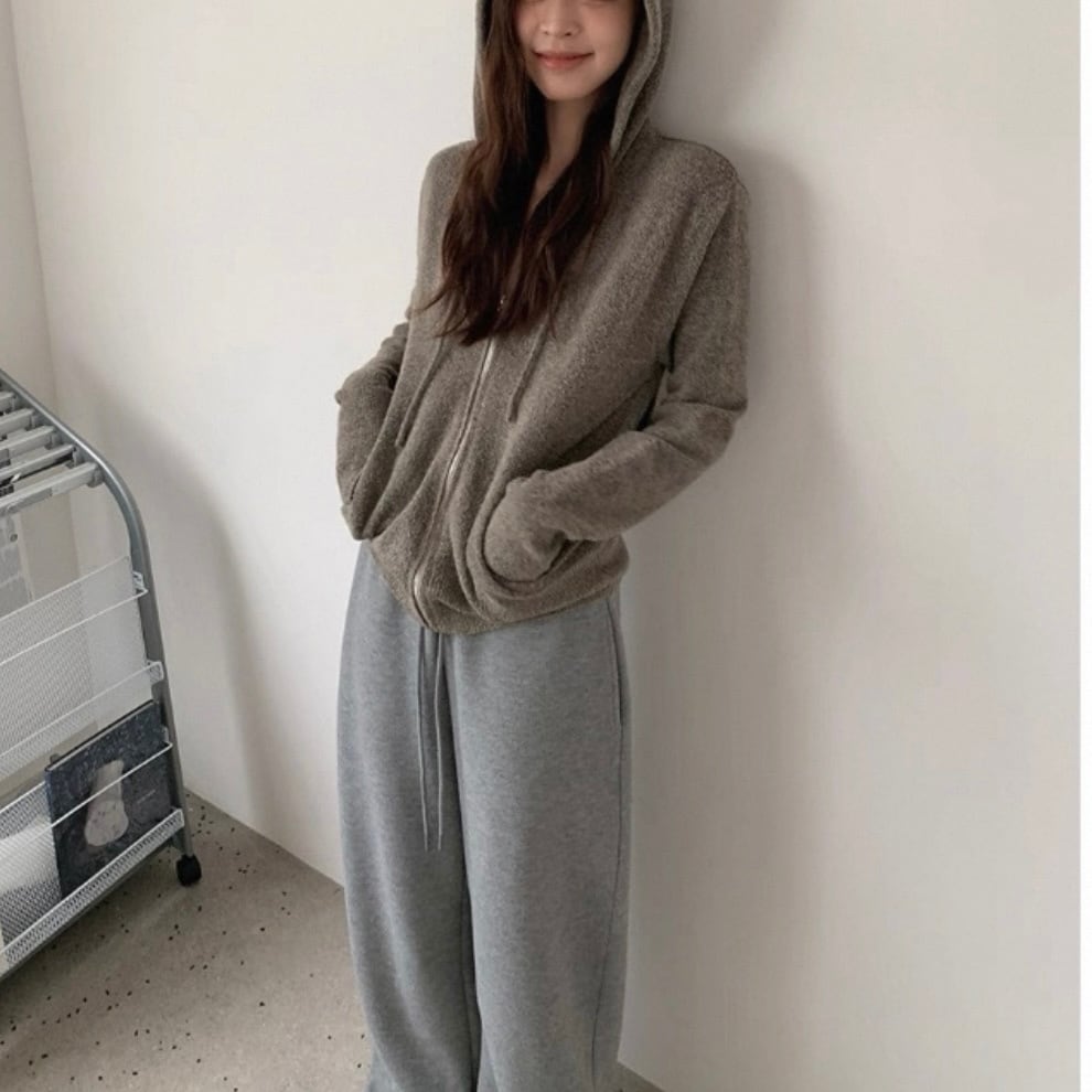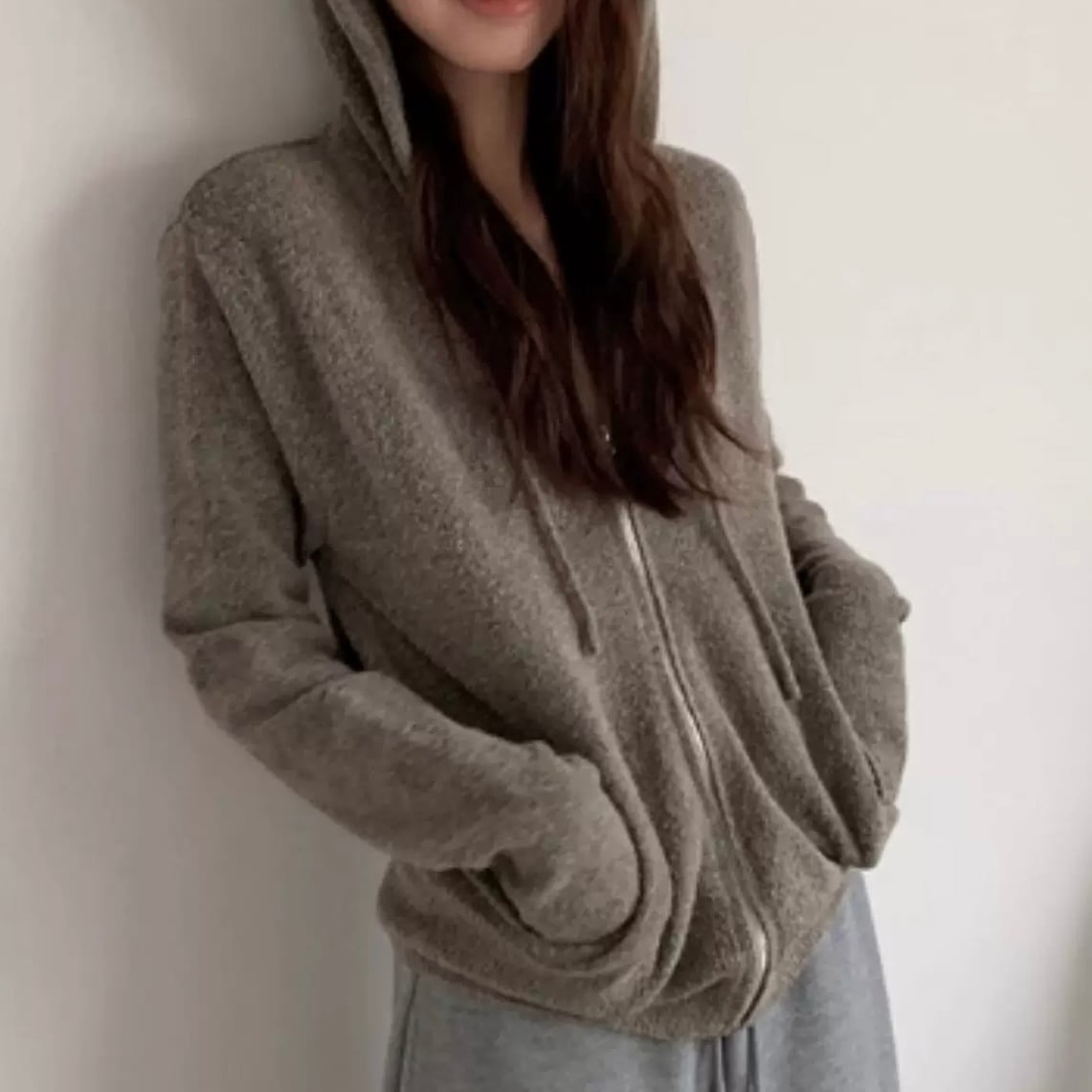 リラックス感漂う、ジップアップフード付きニットパーカー。