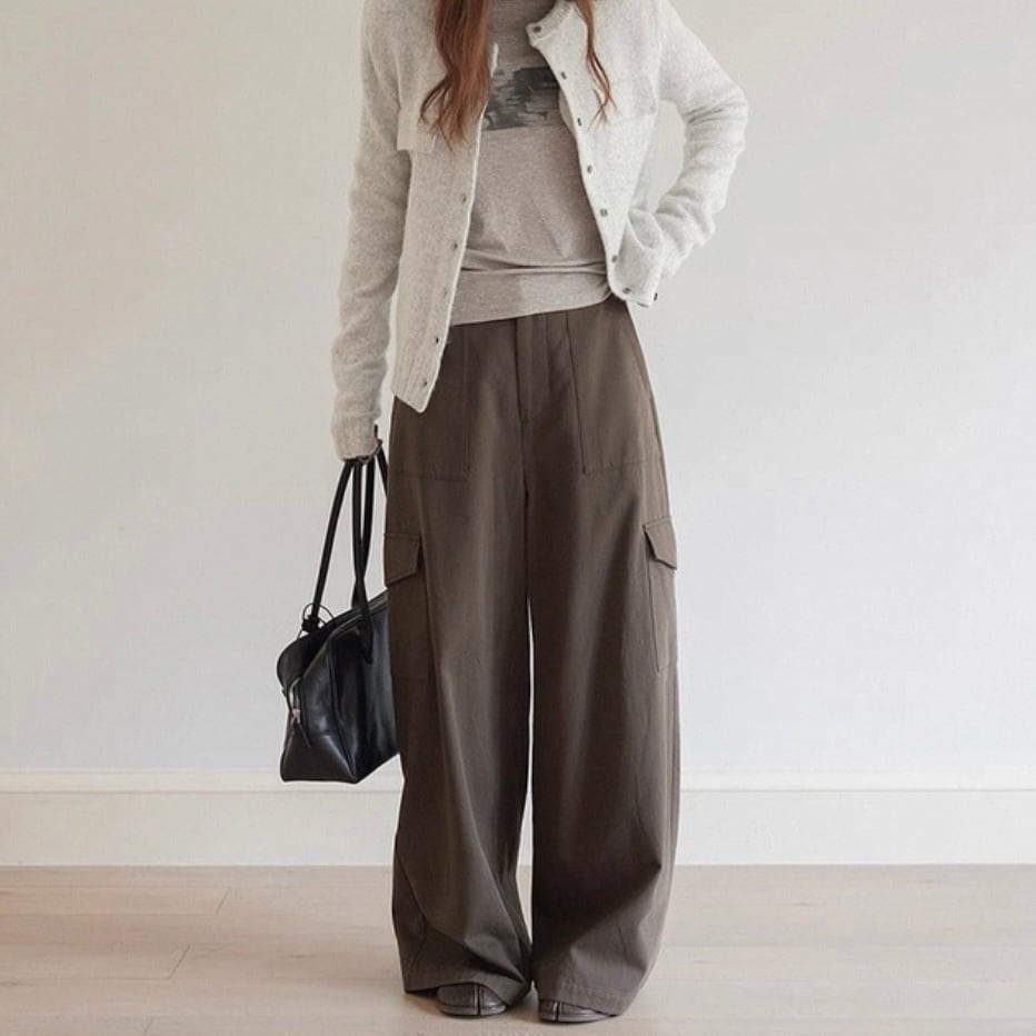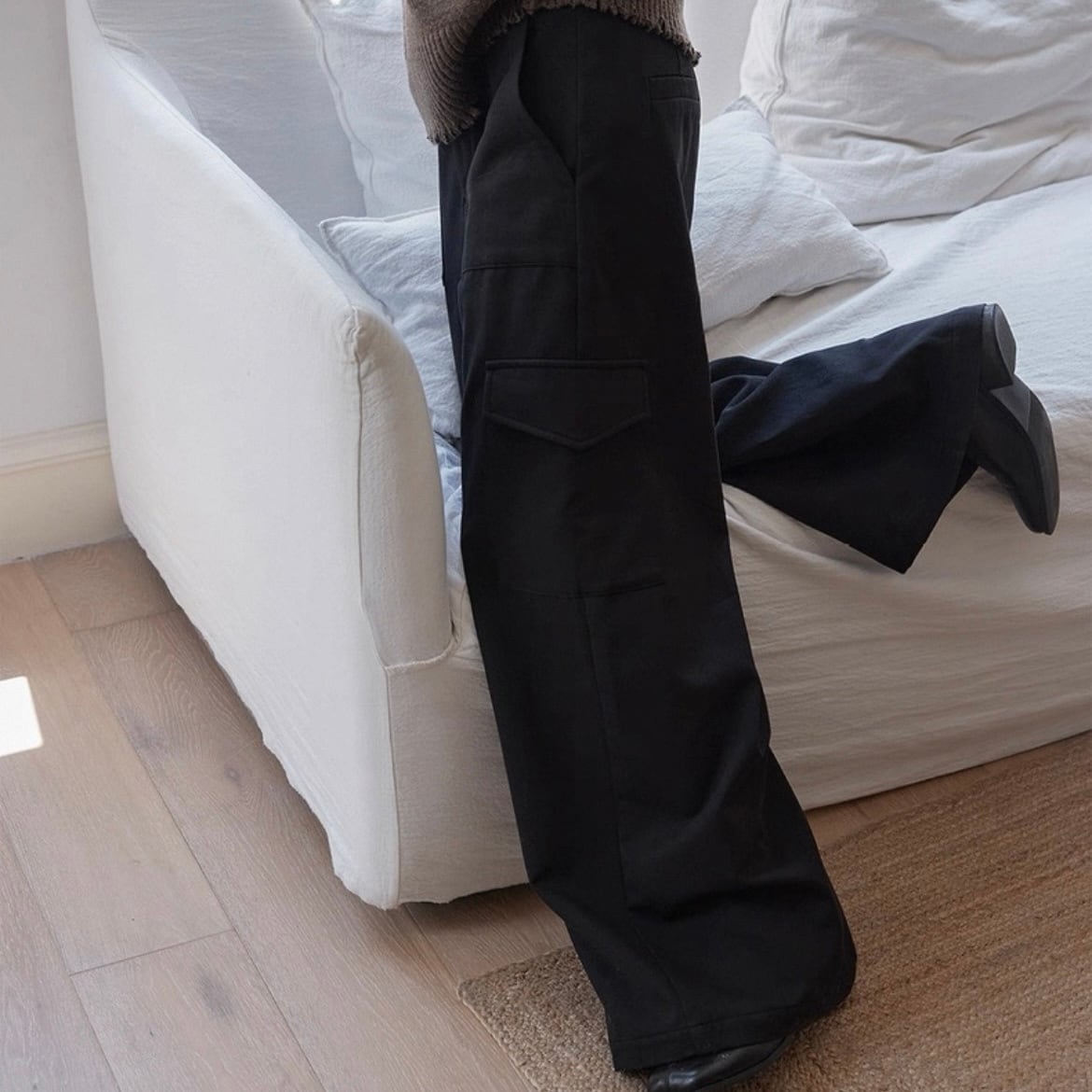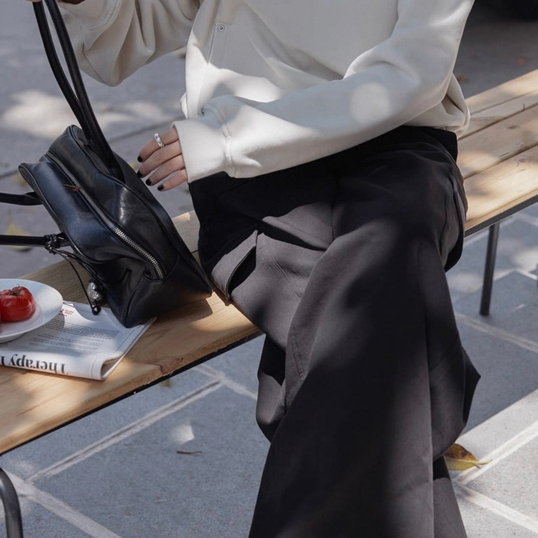 フルレングスで脚長効果も期待できるワイドパンツ。