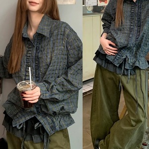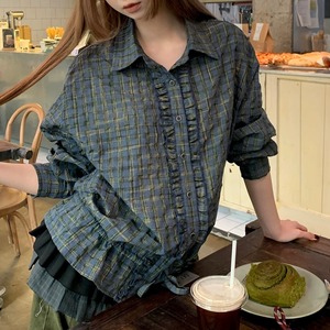 長袖 フリル チェック柄 シャツカラー シャツ SA10166
