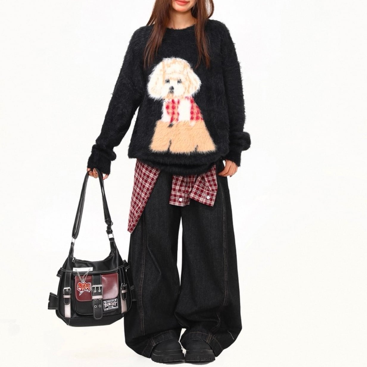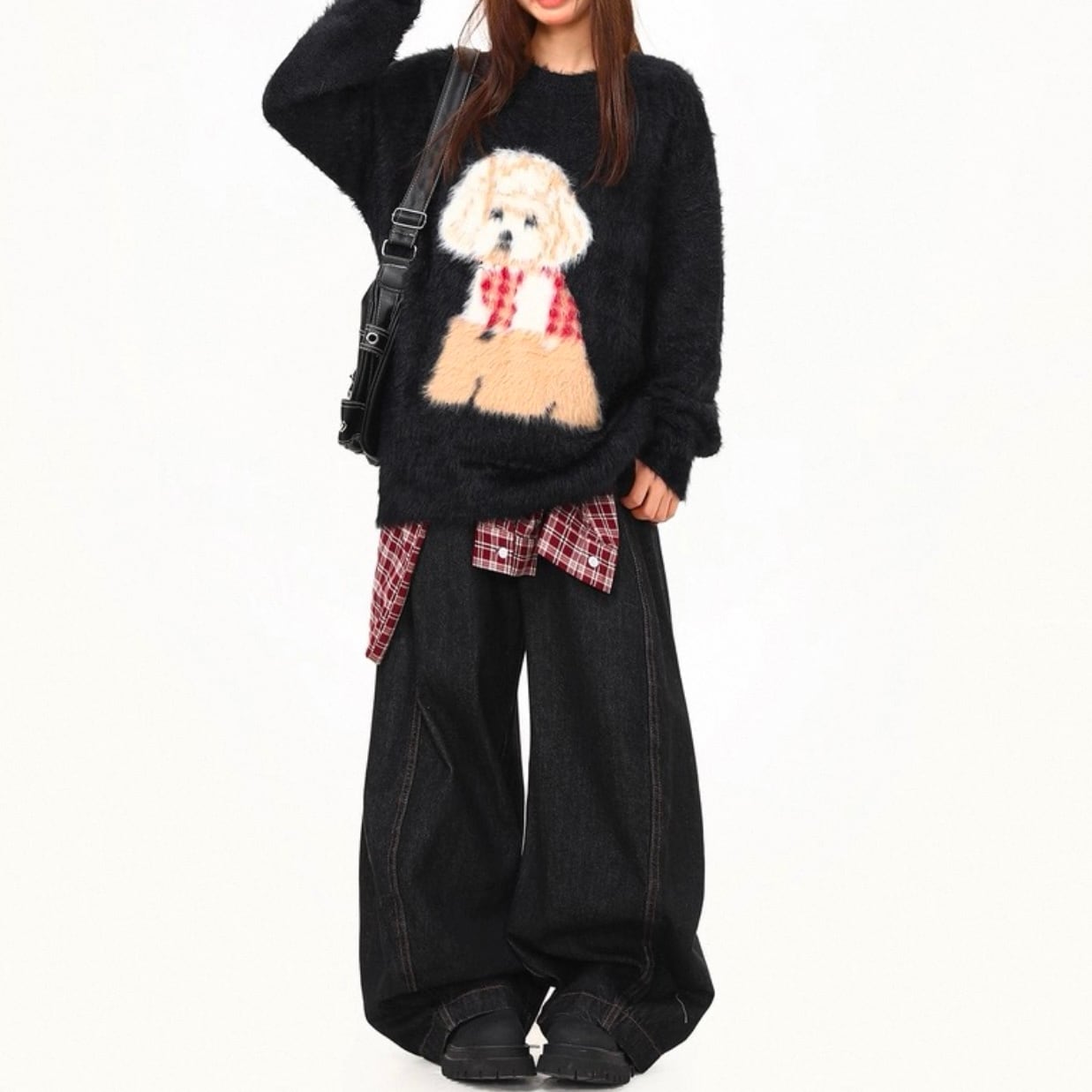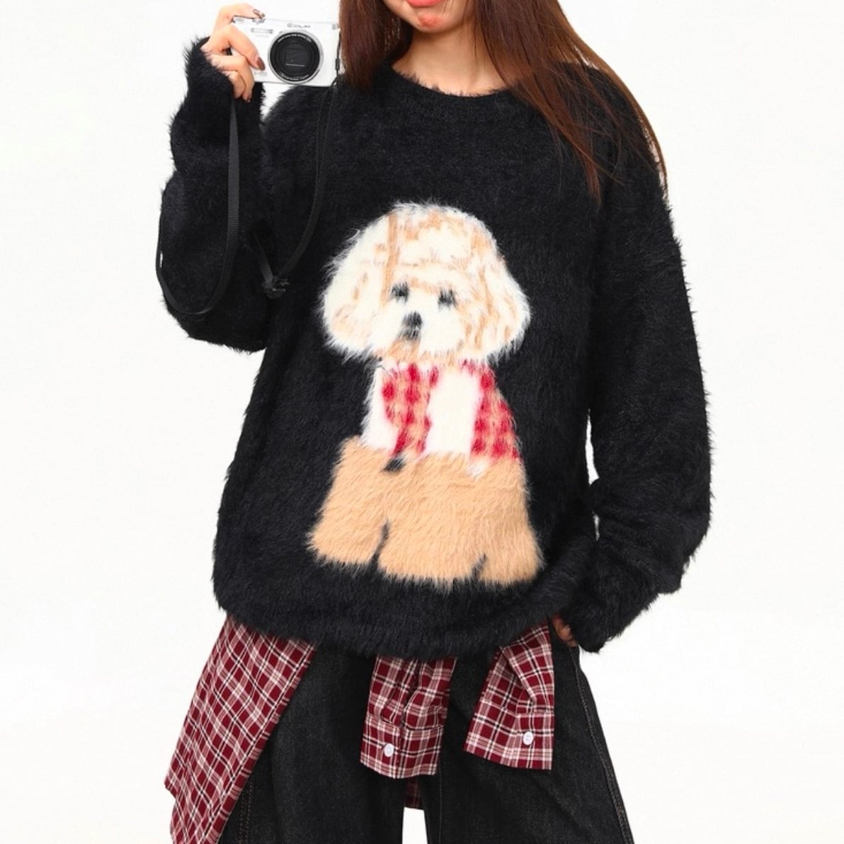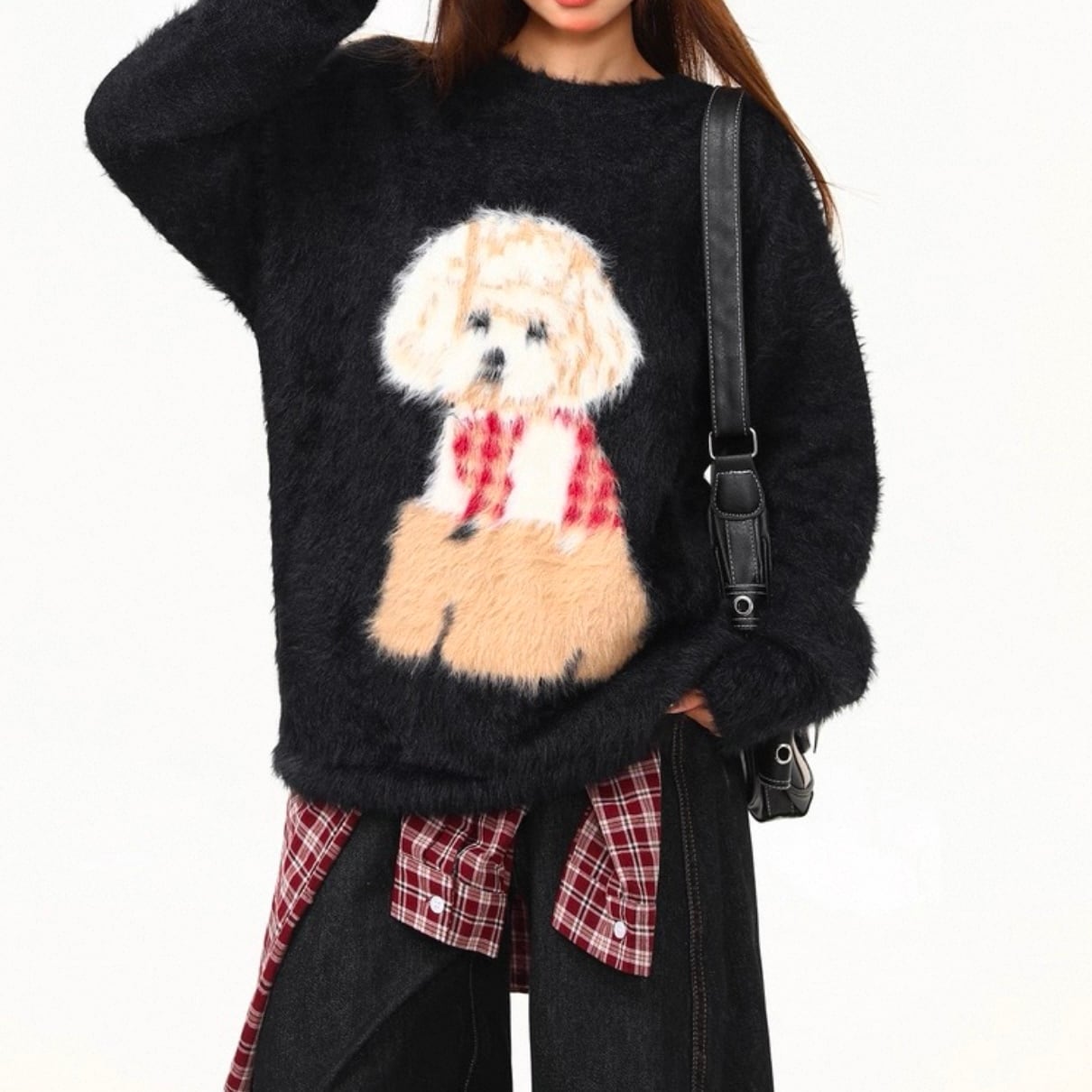 愛らしい犬のプリントが目を引く、オーバーサイズニット。