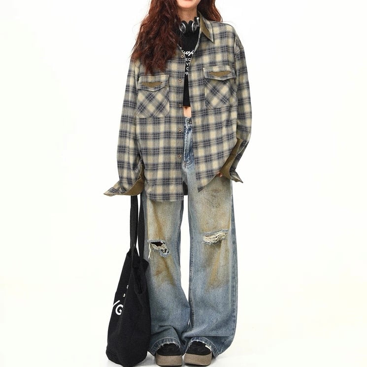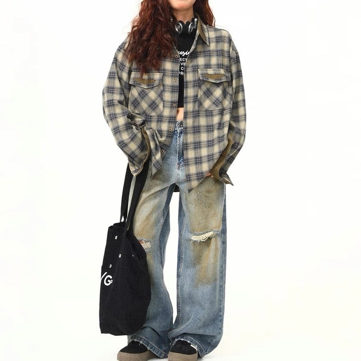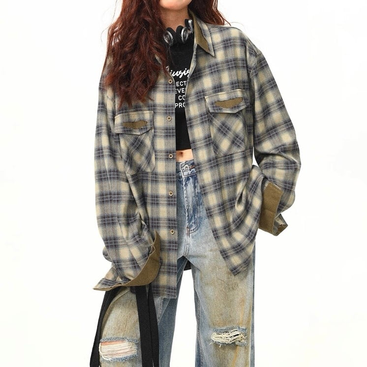 パッチポケット 長袖 オーバーサイズ チェック柄 シャツ S1033